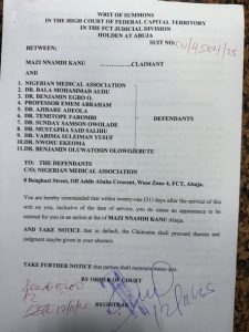 “This is the FCT High Court, Abuja. Mazi Nnamdi Kanu has filed a ₦550 million suit against the Nigerian Medical Association and the 10 medical doctors who conspired and issued a fake medical report against him,” Opara stated.